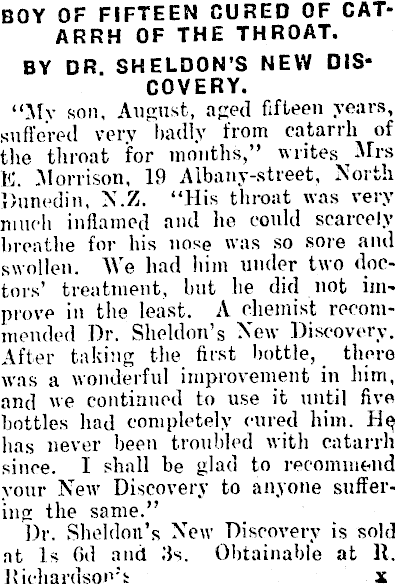 BOY OF FIFTEEN CURED OF CATARRH OF THE THROAT. BY DR. SHELDON’S NEW DISCOVERY. “Mv son, August, aged fifteen years, suffered very badly from catarrh of the throat for months,” writes Mrs K. Morrison, 19 Albany-street, North Dunedin, N.Z. ‘‘His throat was very much inflamed and he could scarcely breathe for his nose was so sore and swollen. We had him under two doctors’ treatment, but he did not improve in the least. A chemist recommended Dr. Sheldon’s New Discovery. After taking the first bottle, there was a wonderful improvement in him. and we continued to use it until five bottles had completely cured him. He lias never been troubled with catarrh since. 1 shall be glad to recommend your New Discovery to anyone suffering the same.” Dr. Sheldon’s New Discovery is sold at Is (id and Its, Obtainable at 11. Kichardsonh x