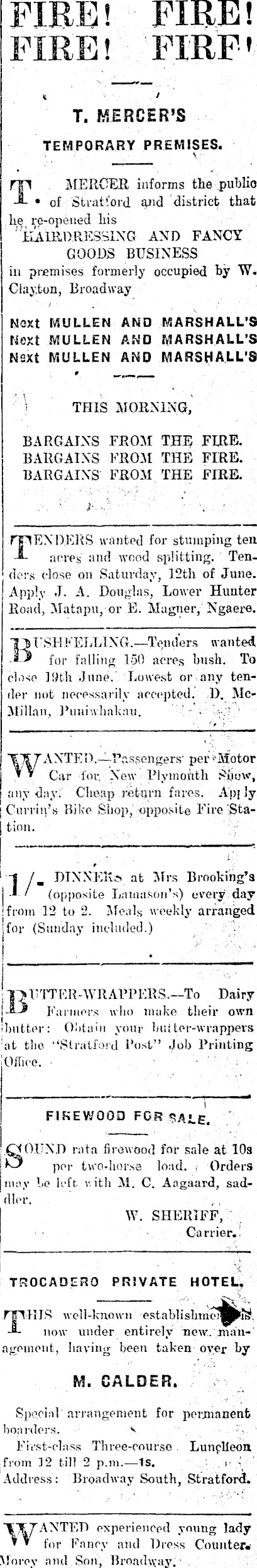 T. MERCER’S TEMPORARY PREMISES. m MERCER informs the public -*L • of Stratford and district that he re-opened his HAIRDRESSING AND FANCY GOODS BUSINESS in premises formerly occupied by W. Clayton, Broadway Next MULLEN AND MARSHALL'S Next MULLEN AND MARSHALL’S Next MULLEN AND MARSHALL’S TFTTS MORNING, BARGAINS FROM THE FIRE. BARGAINS FROM THE FIRE. BARGAINS FROM THE FIRE. nnENDERS wanted for stumping ten I acres and wood splitting. Tenders close on Saturday, 12th of June. Apply J. A. Douglas, Lower Hunter Road, Matapu, or E. Mugner, Ngaere. "I "5 FSH FELLlNG.—Tenders wanted. for falling 150 acres bush. To close 10th June. Lowest or any tender not necessarily accepted. D, McMillan, Buniwhakau, ANTED.—Passengers' per Motor Car for New Ply month Snow, ! any day. Cheap return fares. A'pj ly j Cun-in's Bike Shop, opposite Fire 'Staj tion. i f DINNER.-' at airs Brooking’a ' (opposite Lamason’s) every day from 12 to 2. Meals weekly arranged !for (Sunday included.) t>r 'IT ER-WR Al’ PER S .—To Dairy * Farmers who make their own blitter: Obtain your but tor-wrappers at the “Stratford Post” Job Printing Office. FIREWOOD FOR sale. OOLND rata firewood for sale at 10a j per twodior.se load. Orders | may bo left v. ith M. C. Aagaard, saddlor. W. SHERIFF, Ca trier. TROCADERO PRIVATE HOTEL. miHS well-known establisbmei now under entirely new management, having been taken over by M. CALDER. Special arrangement for permanent hoarders. v Fivst-cla-ss Three-course Luncheon from 12 til! 2 p.m.—ls. Address : Broadway South, Stratford. WANTED experienced young lady for Fancy and Dress Counter* Morey and Son, Broadway.