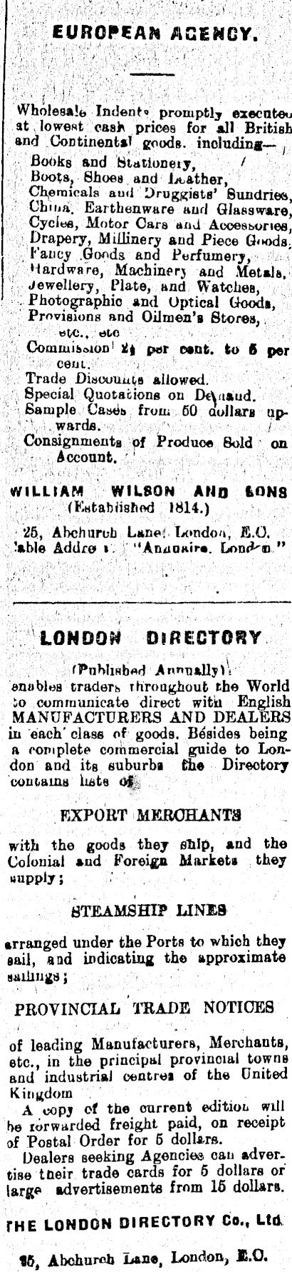 EUROPEAN AGENCY. 5, -■ ,ti ■' ■ -• ■' .;.v ' : : ’ ■ Wholesale Indent promptly exeonbou ®t lowest cash prices for all British and Continental goods, including— Books and Stationery, / Boots, Shoes and leather, Chemicals aud Druggists’ Sundries, Chi oa. Earthenware and Glassware, Cyclee, Motor Cars and Accessories, Drapery, Millinery and Piece Goods. Fancy Goods and Perfumery, Hardware, Machinery and Metals, Jewellery, Plate, and Watches, Photographic and Optical Goods, Provisions and Oilmen’s Stores, tJtC Commisaion' 2$ per cent, to 6 per cent. Trade Discounts allowed. Special Quotations on DeVuaud. Sample Cashs from 60 dollars upwards. / Consignments of Produce Bold on Account. WILLIAM WILSON ANQ LONS (Established 18U.) 26, Abchtiroh Lane: London, E.G. lable Addre ». "AnaoHira. London ” LONDON DIRECTORY A n finally Vr enables traders Throughout the World io communicate direct with English MANUFACTURERS AND DEALERS in each' class of goods. Besides being a complete coriiraercial guide to London and its suburbs the Directory contains lists EXPORT MERCHANTS with the goods they ship, and the Colonial and Foreign Markets they uapply; STEAMSHIP LINES arranged under the Ports to which they sail, aad indicating the approximate sailings; PROVINCIAL TRADE NOTICES of leading Manufacturers, Merchants, etc., in the principal provincial towns and industrial centres of the Dnited Kingdom A copy of the current edition will be rorwarded freight paid, on receipt of Postal Order for 5 dollars. Dealers seeking Agencies can advertise their trade cards for 6 dollars or large advertisements fmm 16 dollars. THE LONDON DIRECTORY Co., Ltd i fl 6, Abohurob Lane, London, JB.O.