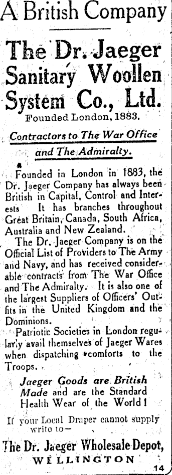 A British Company Founded London, 1883. Contractors to The War Office and The Admiralty. A Founded in London in 1883, the Dr. Jaeger Company has always been British in Capital, Control and Interests It has branches throughout Great Britain, Canada, South Africa, Australia and New Zealand. The Dr. Jaeger Company is on the Official List of Providers to The Army and Navy, and has received considerable contracts from The War Office and The Admiralty. It is also one of the largest Suppliers of Officers’ Outfits in the United Kingdom and the Dominions. Patriotic Societies in London regularly avail themselves of Jaeger Wares when dispatching *comforts to the Troops. Jaeger Goods are British Made and are the Standard Health Wear of the World 1 If your Local Draper cannot supply write io~ The Dr. Jaeger Wholesale Depot, w i luncton