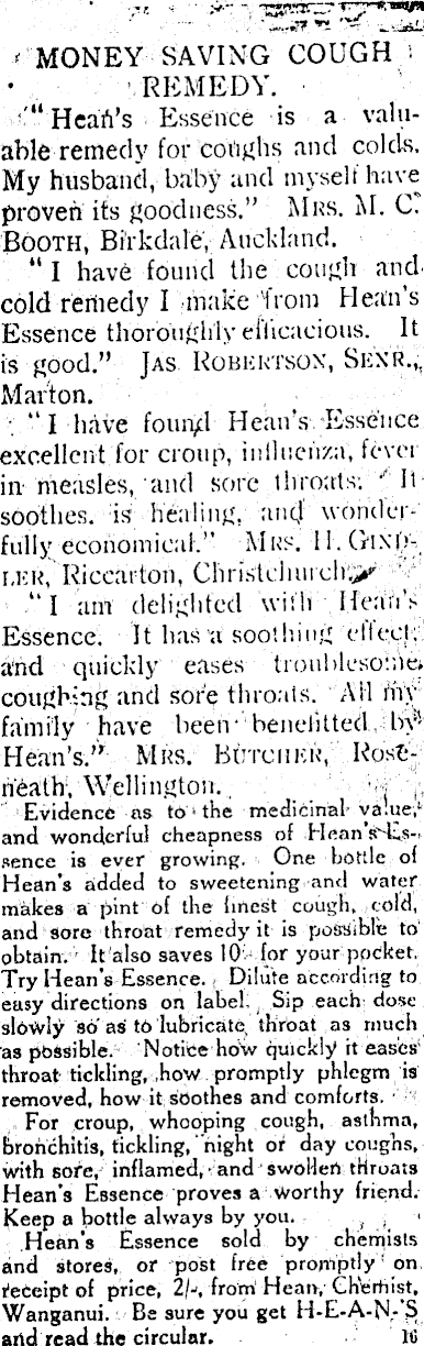 MONEY SAVING COUGH REMEDY. “Heart’s Essence is a valuable remedy for coughs and colds. My husband, baby and myself have proven its goodness.” Mrs. M. C. Booth, Bfrkdale, Auckland. “ I have found the cough and cold reniedy I make from Mean’s Essence thoroughlyeliicacious. It is good.” Jas Robertson, Senr.,. Marton. ” I have foun;! Mean’s Essence excellent for croup, inllucu/.a, fever in measles, and sore throats. It soothes, is healing, and wonderfully economical.” Mrs. 11. Ginbr,KK, Riccarton, Chrislclimch.> f “I am delighted with Heart's Essence. It has a soot lung cited, and quickly eases troublesome, coughing and sore throats. AH my family have been benelitted byMean’s.” Mrs. Butcher, Rost*nealh, Wellington. Evidence as to the medicinal value, 1 and wonderlul cheapness of Mean s'-k.s-sence is ever growing. One bottle of Hean’s added to sweetening and water makes a pint of the hnest cough, told, and sore throat remedy it is possible to obtain. It also saves 10 for your pocket. Try Hean’s Essence. Dilute according to easy directions on label. Sip each dose slowly so as to lubricate, throat as much as possible. Notice how quickly it eases throat tickling, how promptly phlegm is removed, how it soothes and comforts. For croup, whooping cough, asthma, bronchitis, tickling, night or day coughs, with sore, inflamed, and swollen throats Hean’s Essence proves a worthy friend. Keep a bottle always by you. Hean’s Essence sold by chemists and stores, or post free promptly on receipt of price, 2/-, from Mean, Chemist,. Wanganui. Be sure you get H-E-A-N-’S and read the circular. hi