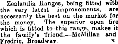 Zealandia lianges, being fitted with the very latest improvements, are necessarily the best on the market for the money. The superior open fire which is fitted to this range, makes it the family’s friend.—McMillan and Fredric, Broadway. *