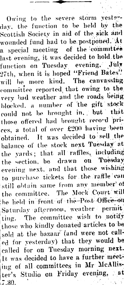 Owing to the severe storm yesterday, the function to be held by the Scottish Society in aid of the sick and wounded fund had to be postponed. At a special meeting of the committee last evening, it was decided to hold.the function on Tuesday evening, July 27th, when it is hoped "Friend Bates" will be more kind. The canvassing committee reported that owing to the very bad weather and the roads being Mocked, a number of the gift stock, could not be brought in. . but that (hose offered bad brought reco-d prices, a total of over £2OO having been obtained. It was decided to sell the balance of the stock next Tuesday at the yards; that all raffles, including the section, be drawn on Tuesday evening next, and that those wishing | to purchase tickets for the raffle can still obtain same from any member*of | the committee. The Mock Court will be held in front of the Post Office-on Saturday afternoon, weather permit ting. The committee wish to notify those who kindly donated articles to'be sold at the bazaar (and were not called for yesterday) that they would be called for on Tuesday morning next. It was decided to have a further meeting of all committees in Mr McAllister's Studio on Friday evening, at .7.30.