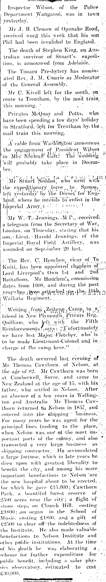 i Inspector Wilson, of the Police I Department Wanganui, was in town I yesterday. .Mr •!. B. Ciemow of Opunake Road, received word tin's week that his son Phil had been invalided to England. The denth of Stephen King, an Australian survivor of Stuart's expedition, is announced from Adelaide. The Timaru Presbytery has nominated Rev. •). SI. Connie as Moderator of the (Jeneral Assembly. Mr C. Kivell left for the south, en route to TrentJuun. by the mail train this morning. Privates MeQuay and Potts, who have been spending a few days' holiday in Stratford, left for Trentham by. the mail train this morning. A cable from "Washington announces ' the engagement of President Wilson to Mis" KorhniA' (hilt; The wedding ! will probably take place in December. Sir Sttiart »eddon 3 who wenfi with' the expeditionary force, f to. Samoa. ' left yesterday" by 'the Dorset for 'England, where he intends "Eo* enlist in the Imperial Army. I >•''.' Mr W.-T.i Jennings, M. P., received* a telegram from the Secretary of War, London, on Thursday, stating that his son. Lieut. Harold Jennings, of the Imperial .Royal Field Artillery, was wounded on September 20 last. The Rev. C. Hnucheu, vicar of Te Kniti. has been appointed chaplain of Lord Liverpool's Own Ist and 2nd Battalions. Mr Hodchen'.s commission dates from 1908, and during the past year-has , 1 ss-\ 3 Waikato Regiment. Writing fron,i f C.'amp. to a." friend ill Xew Plymouth, Private Reg. Quilliam. who Left with the Fifth Reinforcements T.says: ': Fnfortunately we have lost Major -Fletcher, who is to be made Lieutenant-Colonel and in charge of flie camp here." The death occurred last evening of Mr Thomas Cawthorh, of Nelson, at the age of 82. Mr Cawthoru was born at Cambervvell, Surre, and came to New Zealand at the age of 15, with his lather, who settled in Nelson, After an absence of a lew years in Wellington pud Australia Mr Thomas Cawthorn returned to Nelson in 1857, and entered into the shipping ' "business. For many years he was agent for the principal lines trading to the place, when Nelson was one of the most important ports of the colony, and also transacted a very huge business as 1 shipping contractor. He accumulated a large fortune, which in late years he drew upon with greatest liberality to benefit the city, and among his more important benefactions to Nelson are the new hospital about to be erected, lor which he gave £15,000; Cawthorn Park, a beautiful forest reserve of 2500 acres near the city; a flight of stone steps on Church Hill, costing £1800; ,an organ in the School of Music, cOsti'ng I'ISUO. and a gift of £2500 to clear off the indebtedness of the Institute. He also made valuable benefactions to Nelson Institute and other piiMic institutions. At the time of his death he was elaborating a . scheme lor further expenditure for public benefit, including a solar physics observatory, estimated to cost £IO,OOO.