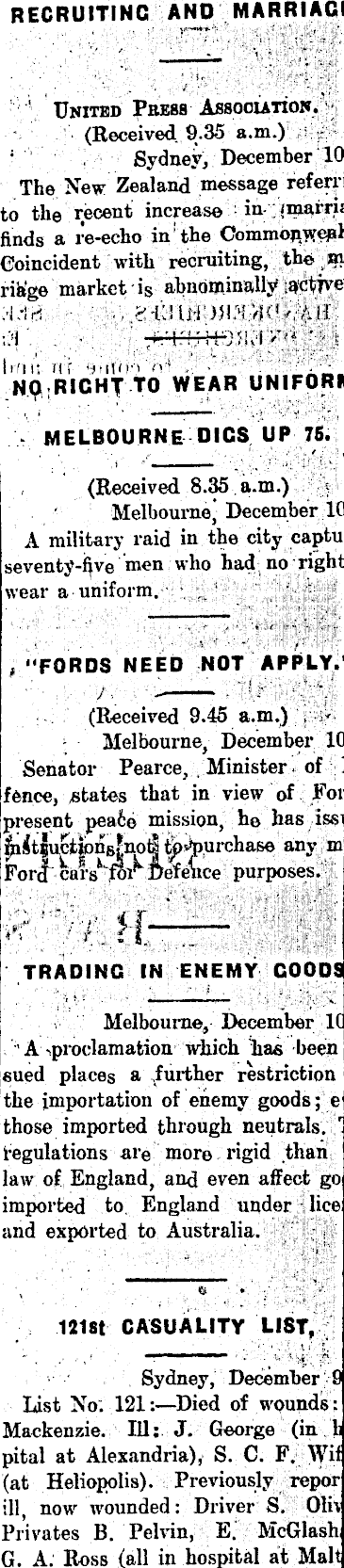 RECRUITING AND MARRIACI United Press Association. (Received. 9.35 a.m.) 1 Sydney, December 10 The New Zealand message referri to the recent increase in imarru finds a re-echo in the Commonweal Coincident with recruiting, the m riage market i s abuominally active ;l-ik . ••• r.:u-! >?<» ah i?| ' ' vj 11 'I r. M I OrllO’.l n • NO RIGHT TO WEAR UNIFORI MELBOURNE DIGS UP 76. (Received 8.35 a.m.) Melbourne, December 10 A military raid in the city captu seventy-five men who had no right wear a uniform. , “FORDS NEED NOT APPLY. 1 (Received 9.45 a.m.) Melbourne, December 10 Senator Pearce, Minister of ! fence, states that in view of Foi present peace mission, he has iss' hi4t|uctions|notj tp-. purchase any m Ford cars fw Defence purposes. £ r h Hr— TRADING IN ENEMY GOODS Melbourne, December 1( A -proclamation which has been sued places a further restriction the importation of enemy goods; e those imported through neutrals, regulations ar e more rigid than law of England, and even affect go imported to England under lice and exported to Australia. 121st CASUALITY LIST, Sydney, December 9 List No. 121:—Died of wounds: Mackenzie. Ill: J. George (in li pital at Alexandria), S. C. F. Wif (at Heliopolis). Previously repor ill, now wounded: Driver S. Olh Privates B. Pelvin, E. McGlash G. A. Ross (all in hospital at Malt