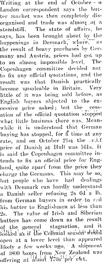 Writing at the end of October - a London correspondent says the butter market was then completely disorganised and trade was almost at a standstill. The state of affairs, lie says, has been brought about by the happenings in Denmark, where, as the result of heavy purchases by Germany and Austria, prices had got up to an almost impossible level. The Copenhagen committee decided not to fix any official quotations, and the result was that Danish practically become unsaleable in Britain. \ cry little of it was being sold before, as English buyers objected xo the excessive price asked; but the cessation of the official quotation stopped what little business there was. Meanwhile it is understood that German buying has stopped, for A time at any rate, and on October 21st the . c-.i.t price of Danish at Hull was Ids. It is said the Copenhagen committee intends to fix an official price for England, quite aparf from the price they charge the Germans. This may he so, hut people who have had dealings with Denmark can hardly understand a Danish seller refusing 2s 6d a lb. from German buyers in order to - d his butter to Englishmen at less than 2s. The value of Irish and Siberian butters has - come down as the result of the general stagnation, and it looked as if Hie Crilbnial seashiV Woiild open at a lower level than appeared likely a few weeks ago. A shipment of 1800 boxes from New Zealand was offering at about VfOs' per c(vt.