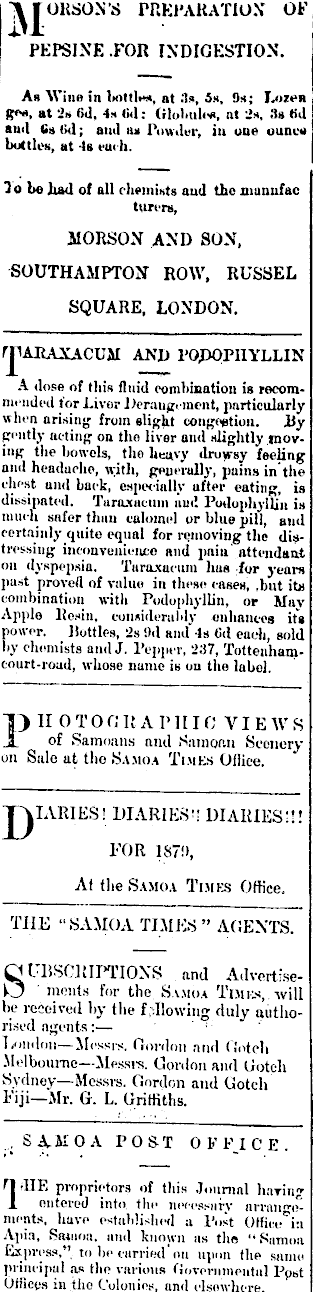 ORSON'S PREPARATION OF PEPBINE FOB [NDIOESTION. As Wine in bottles, ut .:-. it, 9s; I.o; M, at U 6d, 4* li'l: (ilol.ulis. :it 3a, :U and 0s 6d; ami as Powder, in one ou bulk's, ut ls.-n.li lo be Ju»d of all ohamists and tie niaunfuc MORSON AND SON, SOUTHAMPTON ROW, RUSSEL SQUARE, LONDON. riURAXACUM AND PQDOPHYLLIN A doss of this fluid combination is recommended for Liver Derangement, particularly when arising from slight congestion. By [jently acting on the liver and slightly moving the bowels, the heavy drowsy feeling and headache, with, generally, pains in"the chost and back, especially after eating, is dissipated, Taraxacum and Po.lophylhn is much safer than calomel or blue pill, anil certainly quite equal for removing the distressing inconvenience and pain attendant in dyspepsia. Taraxacum has for years past proved of value in these eases, .lmt its ambulation with Podophyllin, or May .Apple Resin, eoiisideraldv enhances its power. Bottles, 2s 9.1 and" Is 6d each, sold by chemists and J. Pepper, 'J:!7, Tottenham,-nurt-ioad. whose name is ou the label. 1) II OTOG RA I'HIC VIEWS 1 of Samoans and Samorm Scenery m Sale ut the Samoa Times Office. j \IARIES: DIARIES': DIARIES:!! FOR 1879, Al the Samoa Times Office, THE .SAMOA TIMES" AGENTS. and Advertiser 3 meuts for the Samoa Tdiks, will lie received by the fallowing duly authorised agents:— Umdon—Messrs. Gordon ami Gotcli Melbourne—Messrs. Gordon and Irotch Sydney—Messrs. (iordon and Gotch Fiji—Mr. (i. L. Griffiths. £ AAIOA POST 0 F KICK. ri iHE proprietors of this Journal hari 1 entered into the necessarv arrani ments, have established a Post Officu Apia, Samoa, and known as the "San principal as tli. Ulliees in the ( ou upon the suine i Governmental Post and elsewhere