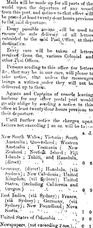 Mails will he made up fur nil purls of the world upon the departure of any vessel from this- port, and notices to that eifeet will he posted at least twenty-four hours previous to the.said departure. 1 livery possible jjieaiir. . will he used to elisure' the safe .delivery of all letters entrusted to the said Post Ufliee, at their deviation. %ery care will he token of letters received from the, various Colonial and other Post Offices. Persons sending to this office for letters d-e., thaftnay ho in onr care, will please to take notice, tltut unless the messenger brings a written order they will delivered np to them. Agents and Captains of vessels leaving harbour for any other postal port would greatly oblige by sending a notice to this 'olliee at least twenty-four hours previous to their departure. Fulfil further notice the charges upon I-fitters not exceeding .} an oz. will be to •B. d. New South Wales;- Victorin; South Australia; Queensland; Western Australia ; Tasmania ; New Zealand ; Norfolk Island ; Fiji Islands ; Tahiti, and Honolulu (direct) .. * ’ 0 6 Germany, (direct); Honolulu, (via Sydney) ; Now Caledonia; United Kingdom, (via Sydney); United States, (including California and . Oregon.) ~ ....09 Fast Indies, (via Sydney); Franco, (via Sydney) ; Genitunv, (via Sydney) ; New Fouudhmd; Nova Scotia. ■. Y* .10 'United Stales of Columbia ~ .. 2 o .Newspapers, (not exceeding 2 oz*.)..' p ]