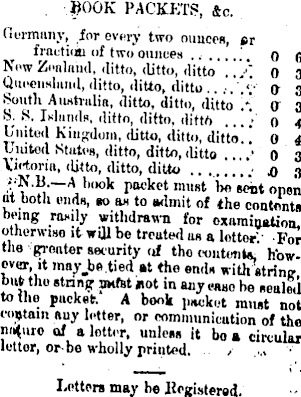 BOOK PACKKTf fi-iii-tiiai of two onnoea ~ n f New Zealand, ditto] ditto, ditto ../ o 3 Queensland, ditto, ditto, ditto .....[ 0 9 South Australia, ditto, ditto, ditto 03 8. 8. Island., ditto, dKte, ditto ..'.'. 0 4 I luted Kingdom, ditto, ditto, ditto 0 4 1 nited States, ditto, ditto, ditto .. .'• 0 3 Y'ietoria, ditto, ditto, ditto .......... .0 3 .^'N-— A hook lmit of the contents » for examination, Ibe treated as a letter' For > r -urity df the contents, however, it inny.be tied at the end* with strfnir out tlie strinjr a«fst not in any ( toihe packet. 1 A book puke, rn,„; ,„„ contain nuy letter, or eomniunieiition of the a letter, unless it bo a circular 1)0 wholly printed.
