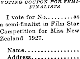 VOTING COUPON FOR SEMIFINALISTS I vote for No as a semi-finaiist in Film Star Competition for Miss New Zealand 1927. Name Address