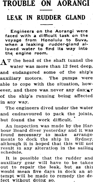 TROUBLE ON AORANGI LEAK IN RUDDER GLAND Engineers on the Aorangi were faced with a difficult task on the voyage from Honolulu to Suva, when a leaking rudder-gland allowed water to find its way into the engine room. the head of the shaft tunnel the water was more than 12 feet deep, and endangered some of the ship’s auxiliary motors. The pumps were able to cope with the situation, however, and there -was never any danr*,r of the ship's running being affected in any way. The engineers dived under the water and endeavoured to pack the joints, but found the work difficult. An inspection was made by the Harbour Board diver yesterday and it was found necessary to make arrangements to dock the ship in Sydney, although it is hoped that this will not result in any alteration in the sailing schedule. It is possible that the rudder and auxiliary gear will have to be taken out to repair the leak, but as this would mean five days in dock an attempt will be made to remedy the defect. without doing so.
