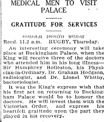 MEDICAL MEN TO VISIT PALACE GRATITUDE FOR SERVICES 11 imoiffo ttsmu& Reed. 11.2 a.m. RUGBY, Thursday. ! An interesting ceremony will take ; place at Buckingham Palace, when the i King will receive three of the doctors I who attended him in his long illness— Sir Humphrey Rolleston, his PliysiI cian-in-Ordinary, Dr. Graham Hodgson, I radiologist, and Dr. Lionel Whitby, bacteriologist. It was the King’s express wish that | his first act on returning to Buckingj ham Palace would be to honour the j doctors. He will invest them with the | Victorian Order, and express his i heartfelt gratitude upon the part they ' played in his recovery. 1