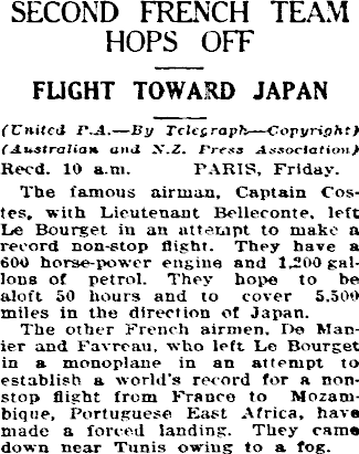 SECOND FRENCH TEAM HOPS OFF FLIGHT TOWARD JAPAN (United r.A.—By Telegraph — Copyright) (Ai*-straJian and .Y.Z. F'ress Association) Reed. 10 a.m. PARIS, Friday. The famous airman, Captain Costes, with Lieutenant Belleconte, left Le Bourget iu au attempt to make a record non-stop flight. They have a 600 horse-power engine and 1.200 gallons of petrol. They hope to be aloft 50 hours and to cover 5.500 miles in the direction of Japan. The other French airmen. De Manier and Favreau, who left Le Bourget in a monoplane in an attempt to establish a world’s record for a nonstop flight from France to Mozambique, Portuguese East Africa, have made a forced landing. They came down near Tunis owing to a fog.