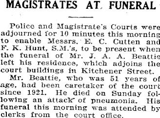 MAGISTRATES AT FUNERAL Police and Magistrate’s Courts were adjourned for 10 minutes this morning to enable Messrs. E. C. Cutten and F. X. Hunt, S.M.’s, to be present when the funeral of Mr. J. A. A. Beattie left his residence, which adjoins the court buildings in Kitchener Street. Mr. Beattie, who was 51 years of age, had been caretaker of the court since 1921. He died on Sunday following an attack' of pneumonia." His funeral this morning was attended byclerks from the court office.