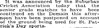 It was announced by the Suburban Cricket Association today that the senior grade matches to have been continued on the Domain this afternoon have been postponed on account of the ground being used for St. Patrick’s Day sports*