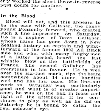 erlv worked the short throw-in-reverse P3.ss dodge for another. In the Blood Blood will out, and this appears to bo the case with Gallaher, the rangy young Ponsonby forward, who created such a fine impression on Saturday. He is a nephew of Dave Gallaher, whose name has gone down in New Zealand history as captain and wingforward of the famous 1905 All Black side and who, with many Rugby men of a latter period, heard the last whistle blow on the battlefields of France. The second Gallaher has everything in his favour. I-Ie is well over the six-foot mark, tips the beam somewhere about 14 stone, handles well and has fair pace. His line-out work on Saturday was particularly good and what is of greater importance, he was on the ball in loose and tight all the afternoon. If he continues to play as well as he did on Saturday he is bound to catch the rep. selector’s eye.