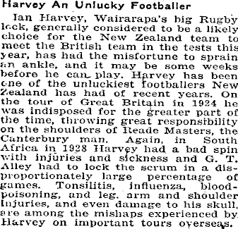 Harvey An Unlucky Footballer Tan Harvey, Wairarapa’s big Rugby lock, generally considered to be a likely choice for the New Zealand team to meet the British team in the tests this year, has had the misfortune to sprain an ankle, and it may be some weeks before he cam play. Harvey has been cne of the unluckiest footballers New Zealand has had of recent years. On the tour of Great Britain in 1924 he was indisposed for the greater part of tiie time, throwing great responsibility on the shoulders of Reade Masters, the Canterbury man. Again, in South Africa in 1928 Harvey had a bad spin with injuries and sickness and G. T. Alley had to lock the scrum in a disproportionately large percentage of games. Tonsilitis, influenza, bloodpoisoning, and leg. arm and shoulder Injuries, and even damage to his skull, are among the mishaps experienced by Harvey on important tours oversells.