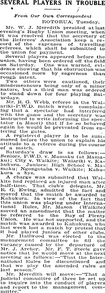 SEVERAL PLAYERS IN TROUBLE j From Our Own Correspondent ROTORUA, Tuesday. Mr. tV. J. Meredith presided at last evening’s Rugby Union meeting, when it was resolved that the secretary of the Referees’ Association keep a record of the expenses of travelling referees, which shall be submitted to the union for payment. Several players appeared before the union, having been ordered off the field on Saturday. One was warned, evidence showing that his obstruction was occasioned more by eagerness than rough intent. Two others were cautioned, their misdemeanours being only of a minor nature, but a third man was ordered to stand down for four playing Saturdays. Mr. R. G. Webb, referee in the Wai-ariki-P.W.D. match wrote complaining that a spectator had interfered with the game and the secretary was instructed to write informing the spectator (a Maori) that if lie so behaved again lie would be prevented from entering the gates. A registered player is to be summoned before the union to explain his attitude to a referee during the course of a match. Saturday’s draw is as follows: Seniors, P.W.D. v. Mamaku (at Mamaku); City v. Waikite; Waiariki v. Kaliuklira. Juniors: High School v. Mamaku; Ngongotaha v. Waikite; Kahukura a bye. A charge was submitted that Waikite had replaced an injured man after half-time. That club’s delegate, Mr. R. G. Ewing, admitted the fact and moved that the match be awarded to Kahukura. In view of the fact that this union was playing under International Rules, Mr. Mason (Waikite) moved an amendment that the matter be referred to the Bay of Plenty Union. lie was not supported, and the match was awarded to Kahukura, who last week lost a match by protest that it had played juniors of other clubs. Mr. Hailwood was elected to the management committee to fill the vacancy caused by the departure of Mr. J. Archer. Mr. F. T. Steele gave notice that he would move at the next meeting as follows:—“That the International Rules be discontinued and that we play the amended rules as last season.” Mr. Meredith will move:—“That a judicial committee of three be set up to inquire into the conduct of players and report to the management committee.”