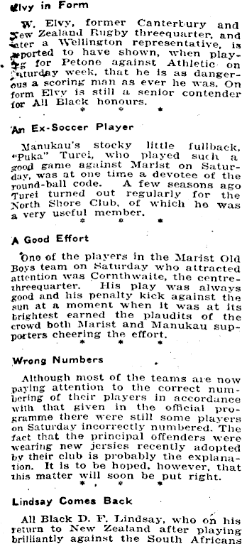 j£lvy in Form •VV. Elvv, former Canterbury and yeiv Zealand Rugby threeqimrter*, and Z.ter a Wellington representative, is sported to have shown, when playfor Petonc against Athletic on 'uturdfiy week, that he is as dangerous a scoring man as ever he was. On form Elvv is still a senior contender for AH Black honours. An Ex-Soccer Player Manukau’s stocky little fullback, ‘•puka” Turei, who played sue h a good game against Marist on Saturday, was at one time a devotee of the round-ball code. A few seasons ago Turei turned out regularly for the North Shore Club, of which he was a very useful member. Good Effort Ono of the players in the Marist Old Boys team on Saturday who attracted attention was Cornthwaite, the centreihreequarter. His play was always good and his penalty kick against the sun at a moment when it was at its brightest earned the plaudits of the crowd both Marist and Manukau supporters cheering the effort. Wrong Numbers Although most of the teams are now paying attention to the correct numbering of their players in accordance with that given in the official programme there were still some players on Saturday incorrectly numbered. The fact that the principal offenders were wearing new jersies recently adopted by their club is probably the explanation. It is to be hoped, however, that this matter will soon be put right. Lindsay Comes Back All Black X). F. Lindsay, who on his return to New’ Zealand after playing brilliantly against the South Africans