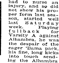 had to nurse an injury, and so did not show his proper form last season, started well last Saturday week. Playing fullback for Varsity A against Alhambra, he was the despair of the eager ‘Bama pack, his fine, long kicks into touch sending the Alhambra