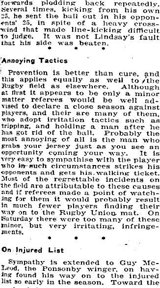 forwards plodding back repeatedly. Several times, kicking from his ow : n 25. he sent the ball out in his opponents’ 25, in spite of a heavy crosswind that made line-kicking difficult to judge. It was not Lindsay s fault that his side was beaten. Annoying Tactics Prevention is better than cure, and this applies equally as well to /the Bugby field as elsewhere. Although at first it appears to be only a minor matter referees would be Well advised to declare a close season against players, and their are many of them, who adopt irritation tactics such as tripping, and holding a man after he has got rid of the ball. Probably the most annoying of all is the man who grabs your jersey just as you see an opportunity coming your way. It is very easy to sympathise with the player who in- such circumstances strikes his opponents and gets bis walking ticket. Most of the regrettable incidents on the field are attributable to these causes and if referees made a point of watching for them it would probably result in much fewer players finding their way on to the Rugby Union- mat. On Saturday there were too many of these minor, but very irritating, infringements. On Injured List Sympathy is extended to Guy McXeod, the Ponsonby winger, on having found his way on to the injured list so early in the season. Toward the
