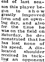 end of last season this player began to s h o w greatly improved form and on opening day, and also for the time he was on the field on Saturday, he demonstrated that he has lost none of his speed. A dislocated shoulder received in tackling an opponent