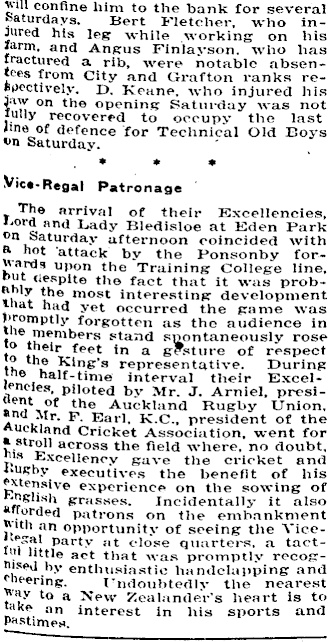 confine him to the bank for several Saturdays. Bert Fletcher, who injured his leg while working on his Jarm, and Angus Fin Jayson, who has fractured a rib, were notable absentees from City and Grafton ranks respectively. I). Keane, who injured his Jaw on the opening Saturday was not xu II y recovered to occupy the last fine of defence for Technical Old Boys Saturday. Vice-Regal Patronage T arr^va l of their Excellencies, J'Ord and Lady Bledisloe at Eden Park °n Saturday afternoon coincided with a attack by the Ponsonby for'nrti'? upon the Training College line. Put despite the fact that it was probil * niost interesting development that had yet occurred the game was promptly forgotten as the audience in members stand spontaneously rose fa ♦, ir fe *t in a gesture of respect ♦h King’s representative. During lH? • interval their Excelncies, piloted by Mr. J. Arniel, presii ,s**- Auckland Rugby Union. . n<^ , , r - K. Earl, K.C., president of the uckland Cricket Association, went for ? - uoross the field where, no doubt. T V S Excellency gave the cricket and bugby executives the benefit of his x tensive experience on the sowing of -hgli.sh grasses. Incidentally it also norderl patrons on the embankment ''>th an opportunity of seeing the Viceparty ; ,t close quarters, a tact- . “ttle act that was promptly rccoghised by enthusiastic handclapping and 'heering. Undoubtedly the nearest 'u>* to a New Zealander’s heart is to take an interest in his sports and Pustinies.