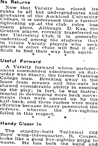 No Returns Now that Varsity has closed its ranks to all but undergraduates and graduates of the Auckland University College, it is understood that a further tightening up -of the club rules lias taken place. Although D. Kaa, the Grafton player, recently transferred to the University Club, it is generallv understood among the students that m future Varsity players who seel; places m other clubs will find it difficult to find their way back again. Useful Forward A X arsity forward whose performances commanded admiration on Saturday was Stacey, the former Training College man. Breaking away in the loose from scrums and line-outs he c ? nsid ®rable ability in opening JJJ* Play; ill fact, he was instrumental m developing more back movethan were opened up by the and these rushes were more effective because Stacey penetrated the *,? hereas the five-eighths tailed in this respect. Handy Closer In The sturdily-built Technical Old beys wing-threequarter, R. Couper, looks like a good five-eighths going to waste. He has both the build and