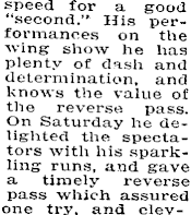 speed for a good “second.” His performances on the wing show he has plenty of dash and determination, and knows the value of the reverse pass. On Saturday he delighted the spectators with his sparkling runs, and gave a timely reverse pass which assured one try, and clev-