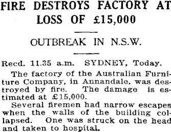 FIRE DESTROYS FACTORY AT LOSS OF £15,000 OUTBREAK IN N.S.W. Reed. 11.35 a.m. SYDNEY, Today. The factory of the Australian Furniture Company, in Annandale, was destroyed by fire. The damage is estimated at £15,000. Several firemen had narrow escapes when the walls of the building collapsed. One was struck on the head and taken to hospital.