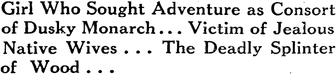 Girl Who Sought Adventure as Consort of Dusky Monarch .. . Victim of Jealous Native Wives . . . The Deadly Splinter of Wood . . .