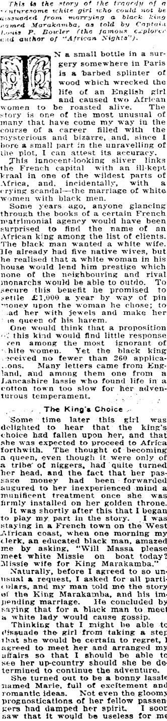 This Is the story of the tragedy of a ' ■ nturesome ichite girl tcho could not be dissuaded from marrying a black king named Marakamba, as told by Captain t.ouis P. Bolder ( the famous explorer i tci author of -‘African Nights"). _ N a small bottle in a surf v Sery somewhere in Paris ’Tt-mIiiTP! * s a ar bed splinter o£ KtfMRZI woo< * wbich wrecked the life of an Knglish girl and ca used two African women to be roasted alive. The story is one of the most unusual of many that have come my way in the course of a career filled with the mysterious and bizarre, and, since I bore a small part in the unravelling of the plot, I can attest its accuracy. Jhis innocent-looking sliver links the French capital with an ill-kept kraal in one of the wildest parts of Africa, and, incidentally, with a crying scandal—the marriage of white women with black men. Some years ago, anyone glancing through the books of a certain French matrimonial agency would have been surprised to find the name of an African king among the list of clients. The black man wanted a white wife. He already had five native wives, but he realised that a white woman in his house would lend him prestige which none of the neighbouring and rival monarchs would be able to outdo. To secure this benefit be promised to setlle £I,OOO a year by way of pin money upon the woman he chose; to ad her with jewels and make her to queen of his harem. One would think that a proposition this kind would find little response ten among the most ignorant of hite women. Yet the black king weired no fewer than 260 applica- . ons. Many letters came from England, and among them one from a Lancashire lassie who found life in a cotton town too slow for her adventurous temperament. The King's Choice Some time later this girl was delighted to hear that the king’s choice had fallen upon her, and that she was expected to proceed to Africa forthwith. The thought of becoming a queen, even though it were only of a tribe of niggers, had quite turned her head, and the fact that her passage money had been forwarded augured to her inexperienced mind a munificent treatment once she was firmly installed on her golden throne. It was shortly after this that I began to play my part In the story. 1 was staying in a French town on the West African coast, when one morning my clerk, an educated black man, amazed me by asking. “Will Massa please meet white Missie on boat today? Missie wife for King Marakamba.” Naturally, before I agreed to so unusual a request, I asked for all partit nlars, and my man told me the story ot the King Marakamba, and his impending marriage. He concluded by saying that for a black man to meet a white lady would cause gossip. Thinking that I might be able to dissuade the girl from taking a step ihat she would be certain to regret, I agreed to meet her and arranged my affairs so that I should bo able to see her up-country should she be determined to continue the adventure. She turned out to be a bonny lassie named Marie, full of excitement and romantic ideas. Not even the gloomy prognostications of her fellow passengers had damped her spirit, I soon saw that it would be useless for me