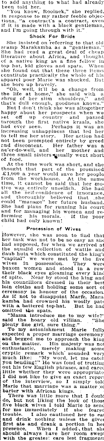 to add anything to what had already been told her. “You know', Rooinek,” she replied, in response to my rather feeble objections, “a contract's a contract, even if it is made with a black gentleman, and I’m going through with it.’’ Shock For Bride She insisted on referring to that old scamp Marakamba as a “gentleman.” She had read a great deal of cheap literature about Africa, and thought of a native king as a fine fellow in top hat, kid gloves and spats. When she found out that these three items constitute practically the whole of his apparel poor Marie was shocked. But she bore up bravely. “Oh, well, it’ll be a change from the life at home,” she said with a shrug of her slim shoulders,” and that’s dull enough, goodness knows.” But I don’t think she was altogether happy about her prospects when we set off up country and passed through the first native kraals, she had ever seen. Perhaps it was an increasing unhappiness that led her to tell me her story. Her action had not been prompted entirely by greed end discontent. Her father was a ne’er-do-well, and her mother and three small sisters fiAsually went short of food. At the time work was short, and she thought that part of the promised £I,OOO a year would save her people from the workhouse. At the same time, it cannot be said that her -motive was entirely unselfish. She had all the self-confidence of ignorance, and thoroughly believed that .she could “manage” her future husband. She had plans for running his court and for managing liig women and reforming his morals. if the poor child had only known* Procession of Wives However, she was soon to find that her task was not to be so easy as she had supposed, for when we arrived at the squalid collection of wattle and daub huts which constituted the king’s | “capital” we were met by the five | wives in possession. They were buxom women and. stood in a row, their black eyes gleaming every kind of spite. Near by stood the king and his councillors dressed in their best loin cloths and holding some sort of ceremony in honour of the occasion. As if not to disappoint Marie, Marakamba had crowned his woolly pate with a battered top-hat. But he had omitted the spats. “Massa introduce me to my wife?” said the hoary old villian. “She plenty fine girl, sure thing.” To my astonishment Marie fully expected a proper marriage ceremony, and begged me to approach the king on the matter. His majesty was not enthusiastic, merely making some cryptic remark which sounded very much like: “My word, let me catch you bending!” He was fond of trotting out his few English phrases, and cared little whether they were appropriate. X did not like to give an exact report of the interview, so I simply told Marie that marriage was a matter of barter with African kings. Thera was little more that I could do, but not liking the look of those five black wives I told Marie to send for me immediately if she feared trouble. I also cautioned her to eat and drink nothing unless the giver first ate and drank a portion in her j presence. When I added , that she I should always l ave her room sw'ept ! with the greates care lest fragments