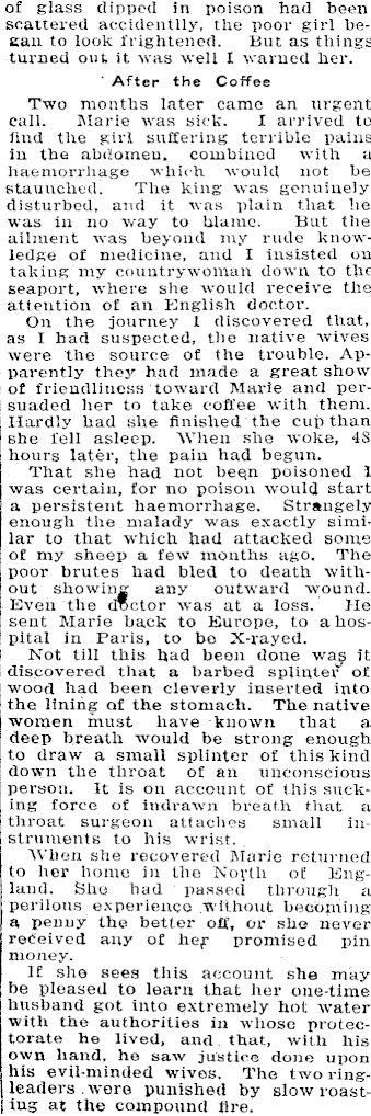 of glass dipped in poison had been ; scattered aecidentlly, the poor girl began to look frightened. But as things turned out it was well I warned her. After the Coffee Two months later came an urgent • call. Marie was sick. I arrived to ; find the girl suffering terrible pains in the abdomen, combined with a j haemorrhage which would not be ! staunched. The king was genuinely j disturbed, and it was plain that he j was in no way to blame. But the ailment was beyond my rude know- ! ledge of medicine, and I insisted on j taking my countrywoman down to the j seaport, where she would receive the | attention of an English doctor. I On the journey I discovered that, I as I had suspected, the native wives were the source of the trouble. Ap- | parently they had made a great show of friendliness toward Marie and persuaded her to take coffee with them. Hardly had she finished the cup than she fell asleep. When she woke, 4S hours later, the pain had begun. That she had not bee.n poisoned 1 was certain, for no poison would start a persistent haemorrhage. Strangely enough the malady was exactly similar to that which had attacked some of my sheep a few months ago. The poor brutes had bled to death without showing any outward wound. Even the doctor was at a loss. He sent Marie back to Europe, to a hospital in Paris, to be X-rayed. Not till this had been done was it discovered that a barbed splinter of wood had been cleverly inserted into the lining of the stomach. The native women must have known that a deep breath would be strong enough to draw a small splinter of this kind down the throat of an unconscious person. It is on account of this sucking force of indrawn breath that a throat surgeon attaches small in--1 struments to his wrist. When she recovered Marie returned !to her home in the North of Eng- ! land. She had passed through a | perilous experience without becoming I a penny the better off, or she never | received any of hef promised pin j money. ! If she sees this account she may ; be pleased to learn that her one-time i husband got into extremely hot water | with the authorities in whose protectorate he lived, and that, with his j own hand, he saw justice done upon i his evil-minded wives. The two ringj leaders .were punished bj r slow roast- | tug at the compound fire.