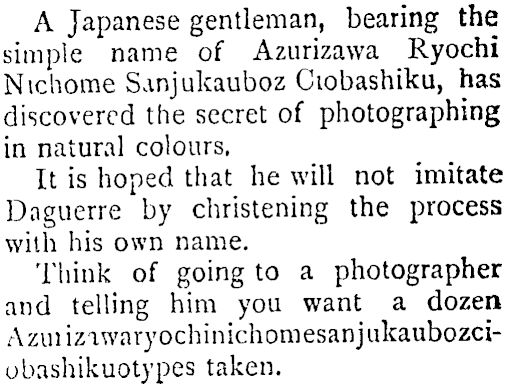 A Japanese gentleman, bearing the simple name of Azurizawa Ryochi Nichome Sanjukauboz Ciobashtku, has discovered the secret of photographing in natural colours. It is hoped that he will not imitate Daguerre by christening the process with his own name. Think of going to a photographer and telling him you want a dozen Azmizawaryochinichomesanjukaubozciobashikuotypes taken.