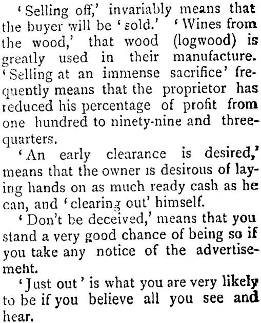 ' Selling off,' invariably means that the buyer will be ' sold.' ' Wines from the wood,' that wood (logwood) is greatly used in their manufacture. 'Selling at an immense sacrifice' frequently means that the proprietor has reduced his percentage of profit from one hundred to ninety-nine and threequarters. 'An early clearance is desired/ means that the owner is desirous of laying hands on as much ready cash as he can, and 'clearing out' himself. * Don't be deceived,' means that you stand a very good chance of being so if you take any notice of the advertisement. 'Just out ' is what you are very likely to be if you believe all you see and hear.