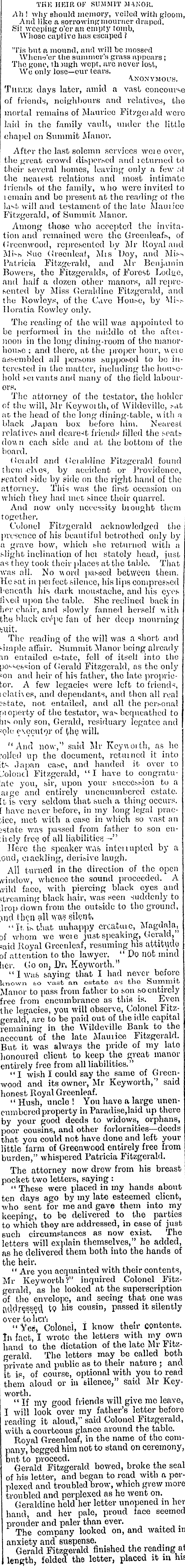 THE HEIR OF SUMMIT M-VisOß. Ah ! why should memory, veiled with gloom, And like a sorrowing mourner draped. Sit weeping o'er an empty tomb, Whose captive has escaped ? Tis but a mound, and will be mossed Whene'er the sumincr's grass appears ; The gone, i lough wept, arc never lo&l, We only lose— our tears. A.NONYMOUS. Thm;e days later, amid a vast concourse of friends, neighbours and relatives, the mortal remains of Maurice Fit/gei aid were laid in the family vault, under the little chapel on Summit Manor. After the last solemn services wei cover, the great crowd dispersed and icturned to their several homes, leaving only a few oi the neaiest relations and most intimate friends oi the family, v>ho were invited to i emain and be present at the reading 1 ot the last will and testament of the late Main ice Fitzgerald, of Summit Manor. Among those who accepted the invitation and remained were the Greenleaf.s, of Greenwood, represented by Mr Royal and Mi--* Sue Grocnleaf, Mis Uoy, and Mis-, Patricia Fitzgerald, and Mr Benjamin Bowers, the Fitzgeralds, of Forest Lodue, and half a dozen other manors, all represented by Miss Geraldine Fitzgerald, and the Rowleys, of the Cave House, by Mi-s lloratia Rowley only. The reading of the will was appointed to be performed in the middle ot the afternoon in the long dining-room of the manorhouse ; and there, at the proper hour, v»eie assembled all persons supposed to be interested in the matter, including the household seivants and many of the iield labourors. The attorney of the testator, the holder of the will, Mr Keywoith, of Wildeville, .-at at the head of the long dining-table, w ith n black .Japan box before him. Nearest relatives and dearest friends- iilled the seats dow n each side and at the bottom of the board. Goiald and Geialdine Fitzgerald found them eh es by accident or Providence, seated side by side on the rig-Jib hand of the attorney. This was the first occasion on which they had met since their quarrel. And now only necessity hi ought them together. Colonel Fitzgerald acknowledged the presence of his beautiful betrothed only by a grave bow, which the returned with a slight inclination of hei stately head, just as they took their places at the table. That was all. No -word passed between them. He sat in pei feet silence, his lips compressed beneath his dark moustache, and his eyes fixed upon the table. She reclined back in her chair, and slowly fanned herself m ith the black crepe fan of her deep mourning buit. The reading of the will was a short and simple affair. Summit Manor being already in entailed estate, fell of itsell into the possession of Gerald Fitzgerald, as the only =on and heir of his father, the late proprietor. A few legacies were left to friends iclathes, and dependants, and then all real ?fctate, not entailed, and all the personal pioperty of the testator, was bequeathed to bis only son, Gerald, residuary legatee and -ol<; executor of will, "And now, 1 ' said Mr Kcyuoith, as lie :oUed up the document, returned it into it-> .Japan ca^e, and handed it over to Jolond Fitzgerald, "I have to congratuate you, sir, upon your succession to a atge and entirely unencumbered estate. [t is very seldom that such a tiling occurs. [ have ne\ cr before, in my long legal practice, met with a case in which so A'ast an estate was passed from father to son en:hcly free of all liabilities:—" Here the speaker was intctiupted by a oud, ciackling, deri&ive laugh. All turned in the direction of the open window, whence the sound proceeded. A tfild face, with piercing black eyes and streaming black hair, was seen suddenly to Irop down from the outside to tho ground, md then all was silent. "It, is that unhappy crcatuie, Magdnla, of whom we weie just speaking;, Gerald, *aid Royal Greenleaf, resuming his attitude of attention to the lawyer. "Do not mind her. Go on, Dr, Key worth. " "hvafc saying that I had never before known fco vast an estate a<3 the Summit Manor to pass from father to son .so entirely free from encumbrance as this is. Even the legacies, you will observe, Colonel Fitzgerald, are to be paid out of the idle capital remaining in the Wildeville Bank to the account of the late Mauiice Fitzgerald. But it was always the pride of my late honoured client to keep the great manor entirely free from amiabilities." ••I wish I could say the same of Greenwood and its owner, Mr Key worth,"' said honest Royal Greenleaf. " Hush, uncle ! You have a large unencumbered property in Paradise,laid up there by your good deeds to widows, orphans, poor cousins, and other forlornities— deeds that you could not have done and left your little farm of Greenwood entirely free from J burden," whispered Patricia Fitzgerald. The attorney now drew from his breast pocket two letters, saying : " These were placed in my hands about ten days ago by my late esteemed client, who sent for me and gave them into my keeping, to be delivered to the parties to which they are addressed, in case of just such circumstances as now exist. The letters will explain themselves," he added, as he delivered them both into the hands of the heir. " Are you acquainted with their contents, Mr Key worth?" inquired Colonel Fitzgerald, as he looked at the superscription of the envelope, and seeing that one was addressed t9 his cousin, passed it silently over to her"; . - , , , , "Vee, Colonel, I know their contents. In fact, I Avrote the letters with my own hand to the dictation of the late Mr Fitzgerald. The letters may be called both private and public as to their nature ; and it is, of course, optional with you to read them aloud or in fcilence," said Mr Keyworth. . | "If my good friends will give mo leave, I will look over my father's letter before reading it aloud," said Colonel Fitzgerald, with a courteous glance around the table. Royal Greenleaf, in the name of tho company, begged him not to stand on ceremony, but to proceed. Gerald Fitzgerald bowed, broke the seal of his lette