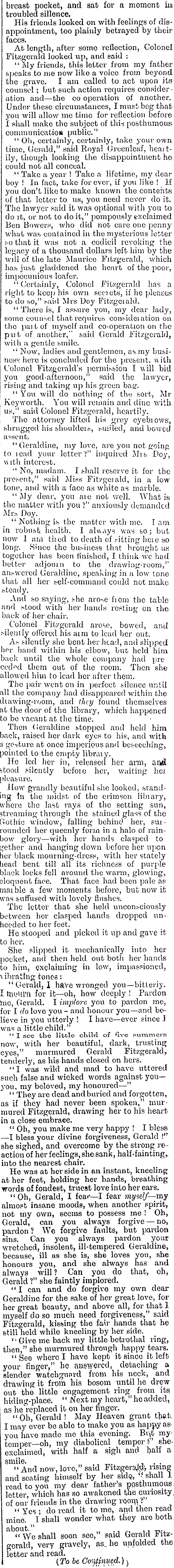breast pocket, and sat for a moment iii troubled sillence. His friends looked on with feelings of disappointment, too plainly betrayed by their faces. At length, after somo reflection, Colonel Fitzgerald looked up, and said : "M y friends, this letter from my father speaks to me now like a voice from beyond the grave. lam called to act upon its counsel ; but such action requires consideration and — the co operation of another. Under these circumstances, I must beg that you will allow me time for reflection before I shall make the subject of this posthumous communication public." " 01), certainly, certainly, take your own time, Gemld," .said Royal Greenleaf, heaitily, though looking the disappointment he could not all conceal. " Take a year ! Take a lifetime, my dearboy ! In fact, take for ever, if you like ! If you don't like to make known the contents of that letter to us, you need never do it. The laAvycr said it was optional with you to do it, or not to do it," pompously exclaimed Ben Bowers, who did not care one penny what was contained in the mysterious letter so that it was not a codicil revoking the legacy of a thousand dollars left him by the will of the late Maurice Fitzgerald, which has just gladdened the heart of the poor, impecunious loafer. "Certainly, Colonel Fitzgerald lias a right to keep his own seci ets, if he pleases to do so," said Mrs Doy Fitzgeiald. " There is, I assure you, my dear lady, some counsel that requires consideration on the paitof myself and co-operation on the put of another," said Gerald Fitzgerald, with a gentle smile. " Now, ladies and gentlemen, as my busi- | ness here is concluded for the present, with Colonel Fitzgerald's permission T will bid t you good-afternoon," said the lawyer, rising and taking up his green ba£. " You will do nothing of the sort, Mr Keyworth. You will remain and dine with us," said Colonel Fitzgerald, heartily. The attorney lifted his grey eyebiows, shrugged his shoulders, smiled, and bowed assent. "Oeraldine, my love, are you not going to icad your letter?" inquired Mis Doy, \\ ith interest. •' No, madam. I shall reserve it for the present," said Mi?s Fit/geiald, in a low tono, and with a face as white as marble. "My dear, you aie not well. What is the matter with you ?" anxiously demanded Mrs Doy. " Nothing is the matter with me. lam in robust health. I always was so; but now 1 am tiled to death of fitting heie so long. Since the business that brought us together has been finished, I think we had better adjourn to the drawing-room,'' answered Ceraldine, speaking in a low tone that all her self-command could not make & toady. And so saying, she arose fiom the table and stood with her hands resting on the back of her chair. Colonel Fitzgerald arose, bowed, and silently offered his aim to lead her out. As silently she bent her head, and slipped iipr hand within his elbow, but held him back until the whole company had pre cecW them out of the room. Then she allowed him to lead her after them. The pair went on in perfect silence until all the company had disappeared within the diawing-room, and they found themselves at the door of the library, which happened to be vacant at the time. Then Geraldine stopped and held him back, raised her dark eyes to his, and with a gesture at once imperious and beseeching, pointed to the empty libraiy. He led her in, released her arm, aivi stood silently befoie her, waiting hci pleasure. How grandly beautiful she looked, standing In the midst of the crimson libiary, where the last rays of the setting sun, streaming through the stained glass of the fiothic window, falling behind her, surrounded her queenly form in a halo of rainbow glory — with her hands clasped to Ljether and hanging down before her upon her black mourning-dress, with her stately head bent till all its richness of purple black locks fell around the warm, glowing, eloquent face. That face had been pale as maible a few moments before, but now it was suffused with lovely flushes. The letter that she held unconsciously between her clasped hands dropped unheeded to her feet. He stooped and picked it up and gave it to her. She slipped it mechanically into her pocket, and then held out both her hands to him, exclaiming in low, impassioned, ibrattng tones : "Gerald, I have wronged you— bitteriy. I UK'Um for it— oh, how deeply ! Pardon hie, Gerald. I implore you to pardon me, for I do love you - and honour you — and believe in you utterly ! I have—ever since J was a little child." " I see the little child of {Ive pnmmers now, with her beautiful, dark, trusting eyes," murmured Gerald Fitzgerald, tenderly, as his hands closed on hers. 1 ' I was wild and mad to have uttered such false and wicked words against you— you, my beloved, my honoured — " " They are dead and buried and forgotten, as if they had never been spoken," murmured Fitzgerald, drawing her to his heart in a close embrace. " Oli, you make me very happy ! I bless — I bless your divine forgiveness, Gerald !" she sighed, and overcome by the strong reaction of her feelings, she sank, half -fainting,, into the nearest chair. He was at her side in an instant, kneeling at her feet, holding her hands, breathing words of fondest, truest love into her ears. "Oh, Gerald, I fear— l fear myself—my almost insane moods, when another spirit, not my own, seems to possess me ! Oh, Gerald, can you always forgive — no, pardon ? We forgive faults, but pardon sins. Can you always pardon your wretched, insolent, ill-tempered Geraldine, because, ill as she is, she loves you, she honours you, and she always has and always will ? Can you do that, oh, Gerald ?" she faintly implored. " I can and do forgive my own dear Geraldine for the sake of her great love, for her great beauty, and above all, for that 1 myself do so much need forgiveness," said Fitzgerald, kis&ing the fair hands that he stilllield while kneeling by her side. ' • Give me back my little betrothal ring, then,