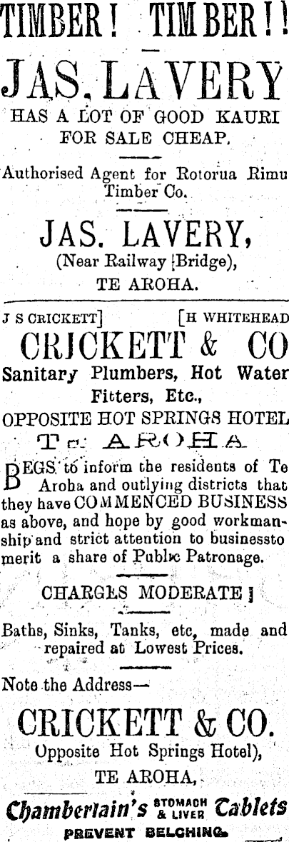 TIMBER! TIMBER!! JAS.LaVERA HAS A LOT OF GOOD KAURI FOR SALE CHEAP. Authorised Agent for Rotorua Rimu Timber Co. JAS. LAVERY, (Near Railway [Bridge), TE AROHA. J s crickett] [h whitehead CRICKETT & CO Sanitary Plumbers, Hot Water Fitters, Etc., OPPOSITE HOT SPRINGS HOTEL T? rc >£3: A. BEGS.' to inform the residents of Te Aroha and outlying districts that they have COMMENCED BUSINESS as above, and hope by good workmanship'and strict attention to businessto merit a share of Public Patronage. CHARGES MODERATE 1 Baths, Sinks, Tanks, etc, made and repaired at Lowest Prices. % ■■■■ Note the Address— CRICKETT & CO. Opposite Hot Springs Hotel), TE AROHA, Qamberiain’s TStIS tablets PREVENT BELQHIH& .