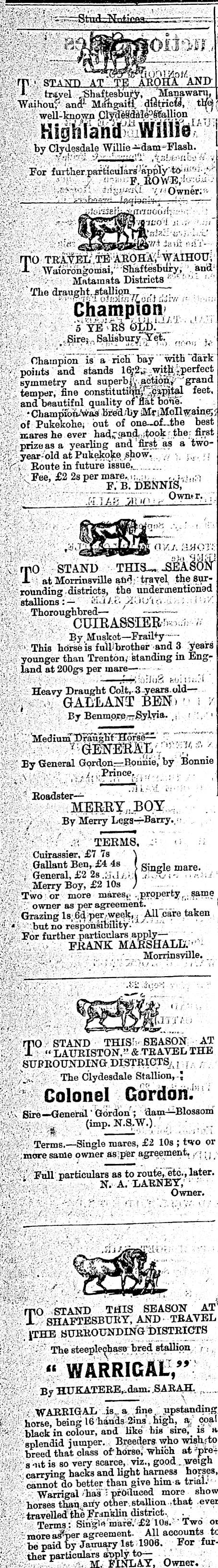 I'ir# ABOHI and rrv stand * travel Mauawaru, WaihouV well-known ClydbSdiile o Stallion by Clydesdale Willie—dam‘Flash. For further particulars apply'td’ 1, , - - F.. BOon - Owner. fii'iO, foragrfaftny.ntPn 70 7 fc O mo travel.te aboha, waihou, jL Waiorongomai, Shaftesbury, and Mataraata Districts Tho ar»aght,«t»(lil!n f , ;; . Champion ... Sire;... fron{ , t< . Champion is a rich bay with dark points and stands symmetry and superb temper, fine cons tit feet, and beautiful quality of flat bone. • Champlon-was bred/by Mr :Mollwaine;v of Pukekohe, out of one—of. .the best mares he ever had>7 :,ancL took the first prize as a yearling and first as a two-year-old at Pukekoke show. Bonte in future issue. Fee, £2 2s per mare. .;.,: F. B. DENNIS, MaelSU , owmra. i‘A rpO STAND THIS— -SEA A at Morrinsville and travel the Bin> rounding districts, the undermentioned stallions K*2/ A- K/t-■ Thoroughbred— - CUIRASSIER 1 By Musket —Frailty This horse is full-brother and 3 years younger than Trenton, standing in England at 200 gs per mare Heavy Draught Colt, 3-years, old— GALLANT BEN ■ By Benmore—Sylvia. . ' 1 Medium Dr aught~Hofse— ': >< By General Gordon—Bonnie, by Bonnie i, Prince. Boadster — MERRYJBOY By Merry Legs—Barry. TERMS, Cuirassier, £7 7s \ Gallant Ben, £4 4s f c; n „i e General, £2 ® mare. Merry Boy, £2 10s , Two or more mares,- property same owner as per agreement. Grazing Is 6d per week, : All care taken but no responsibility-' For further particulars apply— FRANK MARSHALL. Morrinsville. TO STAND THIS': SEASON AT “ LATJRISTON,” & TRAVEL THE SUPROUNDING DISTRICTS j The Clydesdale Stallion, 5 Colonel Cordon. Sire—General ‘ Gordon ; dam—Blossom (imp. N.S.W.) Terms. —Single mares, £2 10s ; two or more same owner as per agreement. V Full particulars as to route, etc., later. N. A. DABNEY, Owner. STAND THIS SEASON AT' SHAFTESBURY, AND TRAVEL IB SURROUNDING DISTRICTS The steeplechase bred stallion 99 “ WARRIGAL, By BLUKATERE,. dam. .SARAH, WARRIGAL is. a fine, upstanding rse, being 16 hands 2ins high, a, coal ack in colour, and like his sire,, is a lendid jumper. Breeders who wish to eed that class of horse, which at 'ptent is so very scarce, viz., good . weigh rryjng hacks and light harness horses, ,nnot do better than give him a trial. Warrigal has i produced more show )rges that* any other , stallion that ever availed the Franklin district. . Terms: Single mareY £2 10s. Two or ore as-per agreement- All accounts to 3 paid by January Ist 1906. For furter particulars apply to—- * M. FINLAY, Owner,