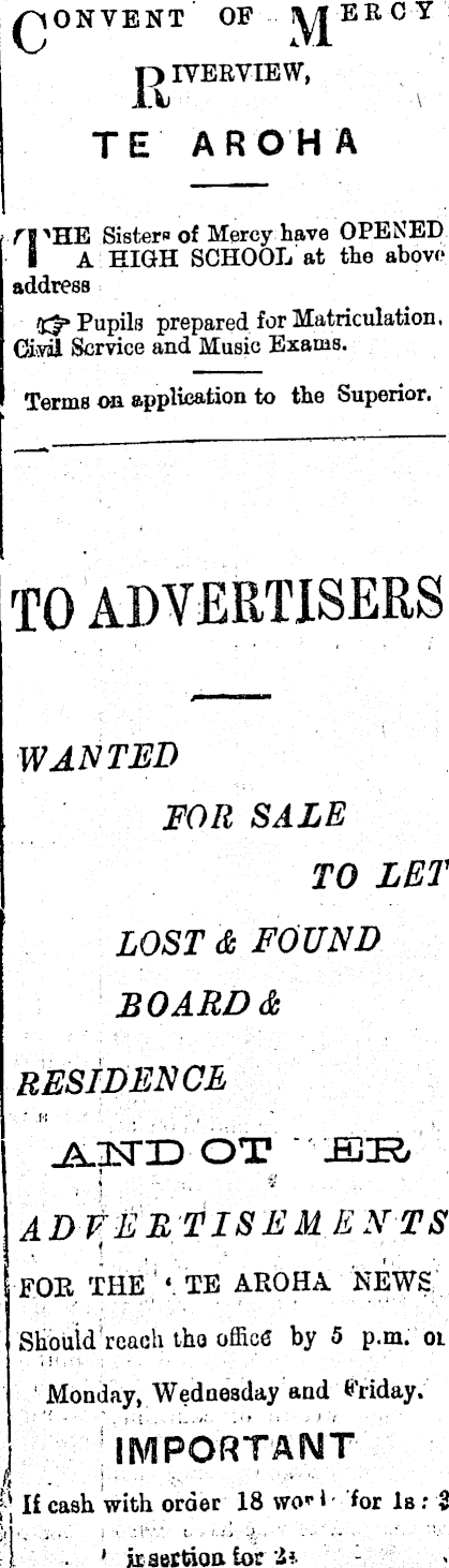 IOONVENT OF iyj ER C Y J^IYERYIEW, TE AROHA rB 'HE Sisters of Mercy have OPENED I A HIGH SCHOOL at the above address Pupils prepared for Matriculation, Civil Service and Music Exams. Terms on application to the Superior. TO advertisers WANTED FOR SALE TO LET LOST & FOUND BOARD & RESIDENCE * !*! JLI sTO OT SB advertis e m. en ts FOE THE «. TE AROHA NEWS Should reach tho office by 5 p.m. ol Monday, Wednesday and Friday. IMPORTANT 'lf cash with order 18 wo r l for Is : 2 I ' jxaertioa for ii 1