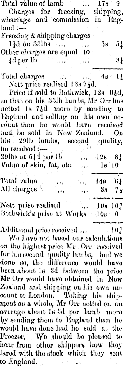 Total value of lamb ... 17s 9 Charges for freezing, shipping, wharfage and commission in England : Freezing & shipping charges Ijd on 33lbs ... ~, 3s 5j Other charges arc equal to \d per lb ... ... 81 Total charges ... ... 4 s 1J Nett price realised 13s 7jd. Price if sold to Buthwiek, 12s OLI, so that on his 331 b lambs, Mr Orr has netted Is 7pl more by sending to England and selling on his own account than ho would havo received had be sold in New Zealand. On his 291 b lambs, socqnd quality, he received:*— 29lbs at s|d per Jb 12s 8j Value of skin, fat, etc. ... Is 10 Total, value ~, ... L|h Of All charges ~, ~, 3s 7i Nett price realised ~, 10s 10 Both wick’s price at Works 10s 0 Additional price received ... 10 jj We 1 ave not based our calculations on the highest price Mr Orr received for his second quality lambs, bad wo done so, tho difforeneo would have boon about 1 s 3d between the price Mr Orr would havo obtained in Now Zealand and shipping on bis own account to London. Taking his shipment as a whole, Mr Orr netted on an average about Is 3d per lamb more by sending them to England than be would havo done had ho sold at the Freezer, Wo shoifld ho pleased to hoar from otlior shippers how thoy fared with tho stock which thoy sent to England.