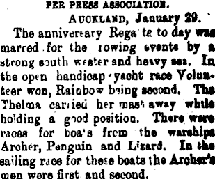 FIB PBES3 ABBOCIATIOI. Auckland, Januwjr 89. " The annivtjrfary Rega te to day waa marred. for the iowiDg event* bjr a strong south n rater and hetvy Ml. Io the open handicap 'yacht race Volunteer won, Rainbow b?ing aooond. Ths Thelma can ieu her •nasi away whtlt holding a giod position. Then wan noes for boa's from the warships Archer, Penguin and L'tard. In tM sailing race for these boats the Atohwft I men were first and second.