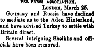 PER PRESS ASSOCIATION. London, March 25. Ge'tnany and Russia hare dtdined to mediate as to the Aden Hinterland, and have advi.ed Turkey to settle with Britain direct. Several intriguing Shaikhs and officials hare been rf moved.