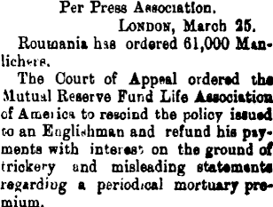 Per Press Association. London, Marob 25. Routaania has ordered 61,000 Man* lichttp. The Court of Appeal ordersd tha Mutual Reserve Fund Life Association of Amei ica to rewind the policy issued to an Englishman and refund his payments with interest on the ground of triokery and misleading statements regarding a periodical mortuary pre* mium.