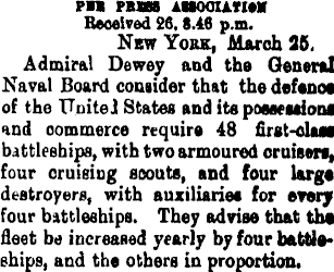 m PBESS ASSOOIATIeN Beoelved 26,8.46 p.m. New York, March 25. Admiral Dewey and the General Naval Board consider that the defenoa of the Unite J States and its possession* and oommerce require 48 first-elaaa battleships, with two armoured cruisers, four cruising scouts, and four larga destroyers, with auxiliaries for amy four battleships. They advise that tha fleet be increased yearly by four battiaships, and the others in proportion.