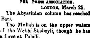 PRE PKBSB ASSOCIATION, Londov, March 25. The Abyssinian column has reached Bari. The Mullah is on the upper waters o{ the Wcbbi Siiebeyli, though he haa a force at Paladi.