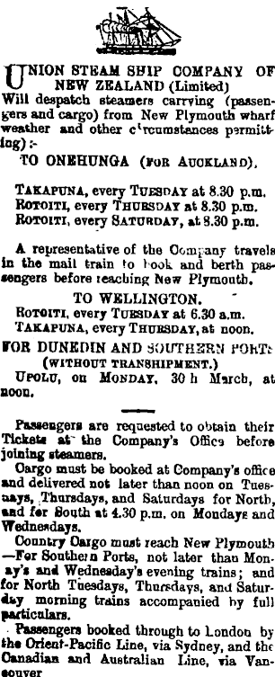 fTNION STEAM SHIP COM PAN V OF U NEW ZEALAND (Limited; Will despatch steamers carrying (passengers and cargo) from New Plymouth wharf weather and other c'rcumstances permitting) TO ONEHUNGA (FOR AuoKLABD), Takapuna, every Tuesday at 8.30 p.m. Botoiti, every Thubsday at 8.30 p.m. Bosom, every Saturday, at 8.30 p.m. A representative of the Company travels in the mail train to took and berth passengers before teaching New Plymouth. TO WELLINGTON. Rotoiti, every Tuesday at 6.30 a.m. TAKAPUNA, every Thubsday, at noon. FOB DUNKDIN AND SOUTHSKtI FQhTt (without transhipment.) TJroixr, on Monday, 30 h Much, at soon. Passengers are requested to obtain their Tickets at the Company's Office before joining steamers. Cargo must be booked at Company's office •nd delivered not later than noon on Tuesaays, .Thursdays, and Saturdays for North, and f*r Booth at 4.30 p.m. on Mondays and Wednesdays. Country Cargo most reach New Plymouth —For Southern Ports, not later than lionay's and Wednesday's evening trains; and for North Tuesdays, Thursdays, and Saturday morning trains accompanied by foil particulars. ■ Passengers booked through to London by the Orient-Pacific Line, via Sydney, and the Canadian and Australian Line, via Vancouver