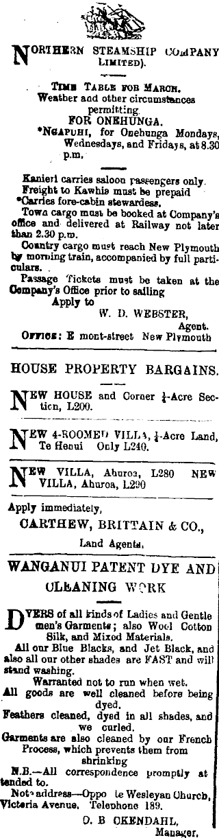 NORIHESN STEAMSHIP UOjdPANY Limited). Ton Table fob March. Weather and other circumstances permitting. FOR ONKHUNGA. *Nmpuhi, for Onehunga Mondays, Wednesdays, and Fridajs, at 8.30 p.m. Kanieri carries saloon passengers only. Freight to Kawhia mast he prepaid •Carries fore-cabin stewardess, Towa cargo most be booked at Company's offlce and delivered at Railway not later than 2.30 p.m. Ooantry cargo mu°t reach New Plymouth ly morning train, accompanied by full particulars. . Passage Tickets must be taken at the Company's Office prior to sailing Apply to W. I). WEBSTER, Agent. Or net: B mont-street New Plymouth HOUSE PROPERTY BARGAINS. "VTBW HOUSE and Corner J-Acre SecJ.l ticn, L2OO. NEW 4-KOOME I ' Land, Te Heoui Only L 240. NEW VILLA, Ahuroa, L2BO NEW VILLA, Ahnroa, L 290 Apply immediately, OARTHEW, BRITTAIN & CO., Land Agents, WANGANUI PATENT DYE AND CLEANING \V?RK DYBBB of all kinds of Ladies and Gentle men's Garments; also Wool Cotton Silk, and Mixed Materials. All our Bine Blacks, and Jet Black, and also all our other Bhades are FAST and wil) stand washing. Warranted not to run when wet. All goods are well cleaned before being dyed. Feathers cleaned, dyed in a)l shades, and we curled. Garments are also cleaned by onr French Process, which prevents them from shrinking N.B.—All correspondence promptly at tended to. Not' address—Oppo le Wesleyan Uhurcb, Victoria Avenue, Teleohone 189. 0. B OKENDAHL, Manager,
