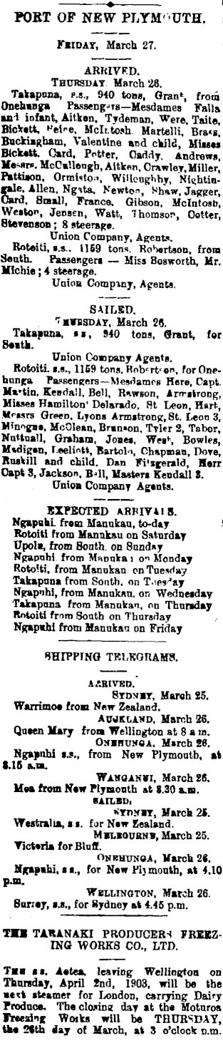 PORT OF NEW PLYMOUTH, i Fiidat, March 27. ARRIVED. Thursday March 28. Takapona, e.g., 940 tone. Gran', from Onehanga Passengers—Mesdamea Falla ani infant, Aitken, Tyderoan, Were, Tails, Birtett, Kelre, Mclr.tosh Martelli, Bra«g, Buckingham, Valentine and child, mi- m Btckatt. Card, PrWer, Caddy. Andrew*. M»w. McCaUeogb, Aitken, Crawley, Miller, httiaon, Ormisto., WiHonghhy, Nit-htin-gale, Allen, Ngita, Kewten, Shaw, Jagger, Card, Small, France, Gibson, Mcintosh, Weato", Jensen, Watt, Thomson, Ootter, BteTenson; 8 steerage. Union Company, Agent:*. Roteiti, ».s.. 1169 tons. Robertson, from Senth. Passenger! Miss Bosworth, Mr. Michie; 4 steerage. Union Company, Agents. SAILED. Tkvbsdat, March 26. Takaposa, ss, 940 tons, Grant, for Seitk. Union Company Agents. Rotoiti. s.s., 1169 tons, Robert'en, forOnehnnga Passengers—Mesriamcs Here, Capt. Ma'tin, Ke>da!l, Bell, Rawson, Armstrong, Misses Hamilton' Delarado, fit Leon, Hart, Messrs Green, Lyons Armstrong, Bt. Leon 3, Minngaa, McOlean, Br«n«on, Tvler 2, Tobor, Nuttuall, Graham, Jones, Wes*, Bowles, Mtdigen, r.eelintt, Bartolt, Chapman, Dotb, Rnskill and child. Dan Fi'sgerald, Horr Capt 3, Jackson, B-11, Masters Kendall 8. Union Company Agents. EXPECTED ARHIV4I S. Ngapuhi. from Mannkan, to-day Rotoiti from Mannkau on Saturday Upola, from Boath. on Bnnd*y Ngapnhi. from Manuka i o" Monday Rotoiti, from Mannkan on Tuesday Takapuna from South. on T.ier'ay Ngapnhi, from Mannkan, or. Wednesday Takapnna from Mannkan, on Thursday Rotoiti from South on Thursday Ngapahi from Mannkan on Friday SHIPPING TELEGRAMS. ARRIVED. Stdmit, Marsh 25. Warrimoe from New Zealand. AvdKLAWD, March 26. Queen Mary from Wellington at 8 a in. Okbhunsa. March 86. Ngapnhi ia, from New Plymouth, at •.15 a.m. WANOANVI, March 26. Hea from tf«w Plymontb at 5.30 a.m. SAILED, nmxwT, March 2t. Westralia, s i. far New Zealand. Milbodbns, March 25. Victoria for Bluff. Onbhunoa, March 26. Ngapahi, s ■., for Haw Plj mouth, at 4.10 p.m. Wbllinoton, Match 26. Surrey, s.s., for Sydney at 4.45 p.m. m TARANAKI PRODUCERS FREEZING WORKS CO., LTD. T«« as. Aetea, leaving Wellington on Thursday, April 2nd, 1903, will be the sett steamer for London, carrying Dairy Produce. The closing day at the Hoturoa Freeing Woiks will be THURSDAY, the 26th day of March, at 3 o'clock p.m.